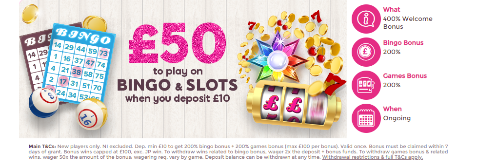 Deposit £10, Get £50 + 15 Free Spins to play on Bingo and Slots Main T&Cs: New players only. NI excluded. Dep. min £10 to get 200% bingo bonus + 200% games bonus (max £100 per bonus). Valid once. Bonus must be claimed within 7 days of grant. Bonus wins capped at £100, exc. JP win. To withdraw wins related to bingo bonus, wager 2x the deposit + bonus funds. To withdraw games bonus & related wins, wager 50x the amount of the bonus; wagering req. vary by game. Deposit balance can be withdrawn at any time. Withdrawal restrictions & full T&Cs apply.