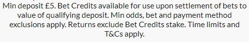 | New customers only. Min deposit £10 (UK debit cards only) Bet £10 at odds of evens (2.0) or greater. Multiple bets with cumulative odds of evens (2.0) count, each leg must have odds of 1/5 (1.2) to be eligible. Each way bets are eligible for this promotion. Upon qualifying bet settlement, 1 x £5.00 Free Bet will be credited to your account. Once the first £5.00 Free Bet has been used a further 3 x £5.00 Free Bets will be applied to your account. Free bet stake not returned after bet settlement. Valid for 7 days, each Free Bet must be used in its entirety | ||