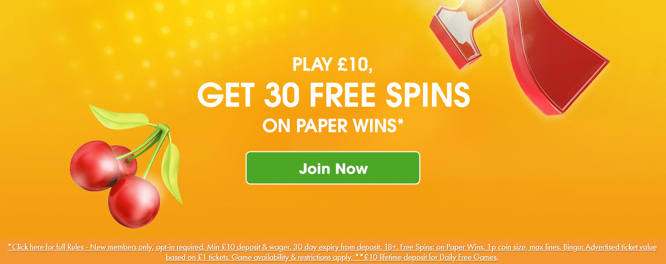 - Welcome Bonus – Play £10, Get £50 of free Bingo or 30 Free Spins on Paper Wins