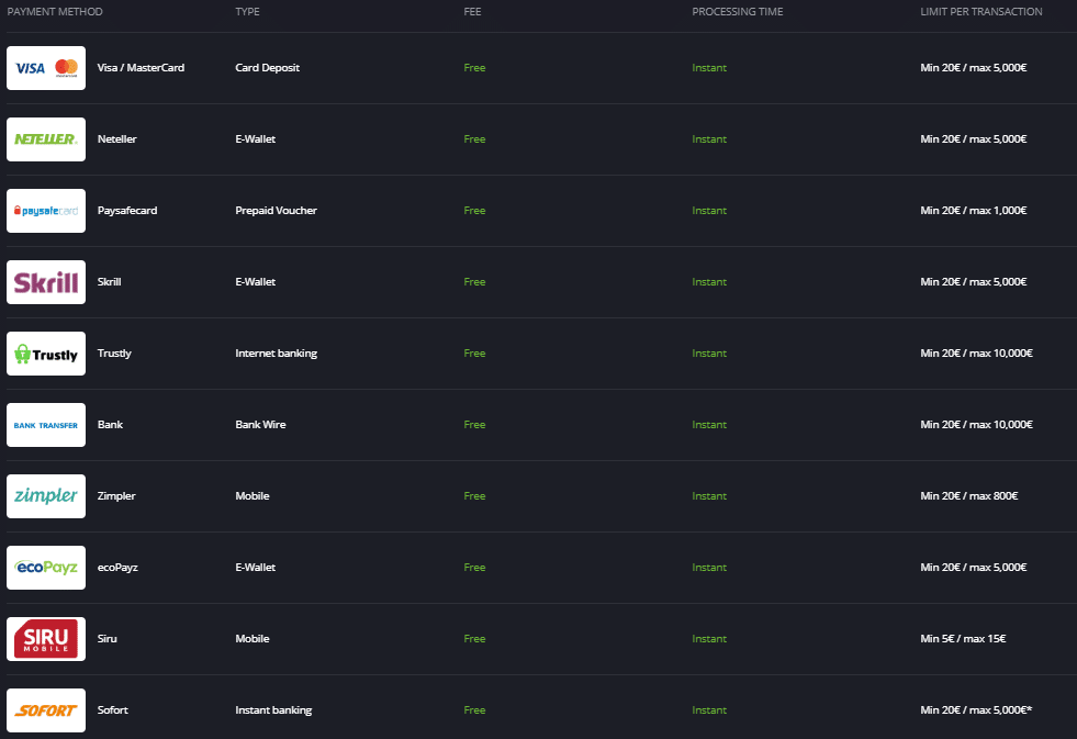 The deposit methods that players can use on this website are Visa, MasterCard, ecoPayz, Neteller, Skrill, Trustly, Bank, Zimpler, and Siru. All of these methods are free to use – meaning you won’t need to pay any fees for using them. Moreover, their use will be recognized instantly by the casino and you will immediately be able to start using them on the games on the website.